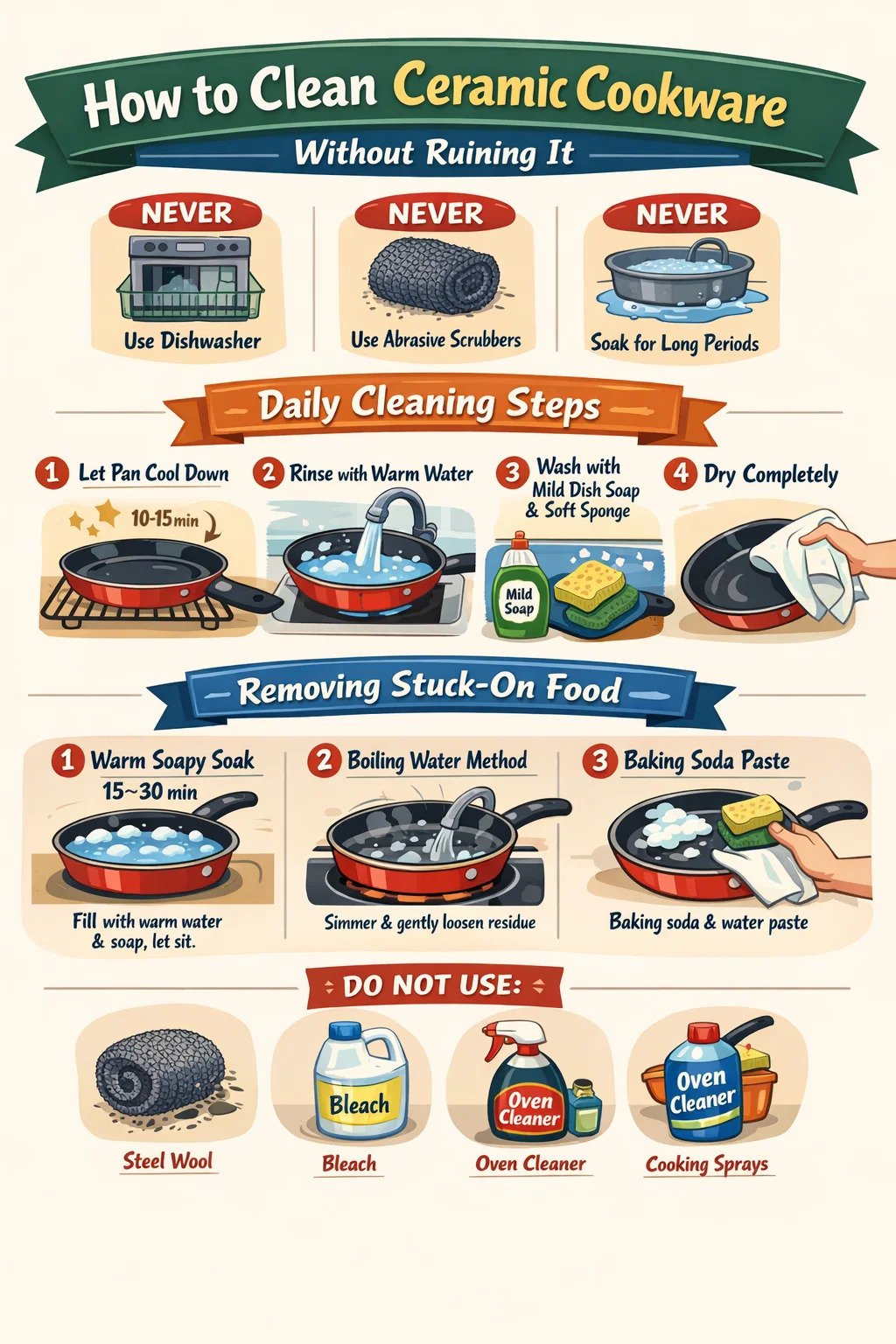Dụng cụ nấu bằng gốm nên được làm sạch bằng nước ấm, một vài giọt xà phòng rửa chén và miếng bọt biển hoặc vải mềm - ngay sau khi nó nguội. Không bao giờ cho nó vào máy rửa chén, không bao giờ sử dụng máy chà sàn có tính ăn mòn và không bao giờ ngâm nó trong thời gian dài. Chỉ riêng ba quy tắc này sẽ kéo dài tuổi thọ của dụng cụ nấu chống dính bằng gốm của bạn một cách đáng kể.