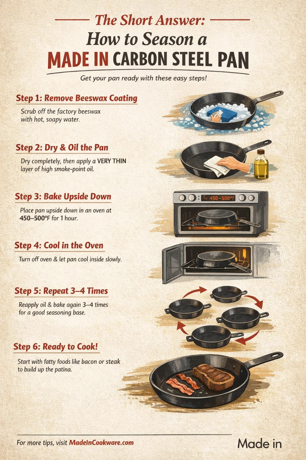 Để làm chín chảo thép carbon Sản xuất tại, bạn rửa sạch lớp phủ sáp ong bảo vệ mà nó mang theo, lau khô hoàn toàn, bôi một lớp dầu rất mỏng có điểm bốc khói cao lên toàn bộ bề mặt và đun nóng trong lò nướng ở nhiệt độ 450–500 ° F cho đến khi dầu polyme hóa thành một lớp cứng, trơn. Lặp lại quá trình đó 3 đến 4 lần trước lần nấu ăn đầu tiên của bạn. Đó là cốt lõi của nó. Mọi thứ khác - các loại dầu cụ thể, sắc thái nhiệt độ lò nướng, phương pháp sử dụng bếp, cách chăm sóc lâu dài - chỉ là sự cải tiến trên khuôn khổ cơ bản đó.