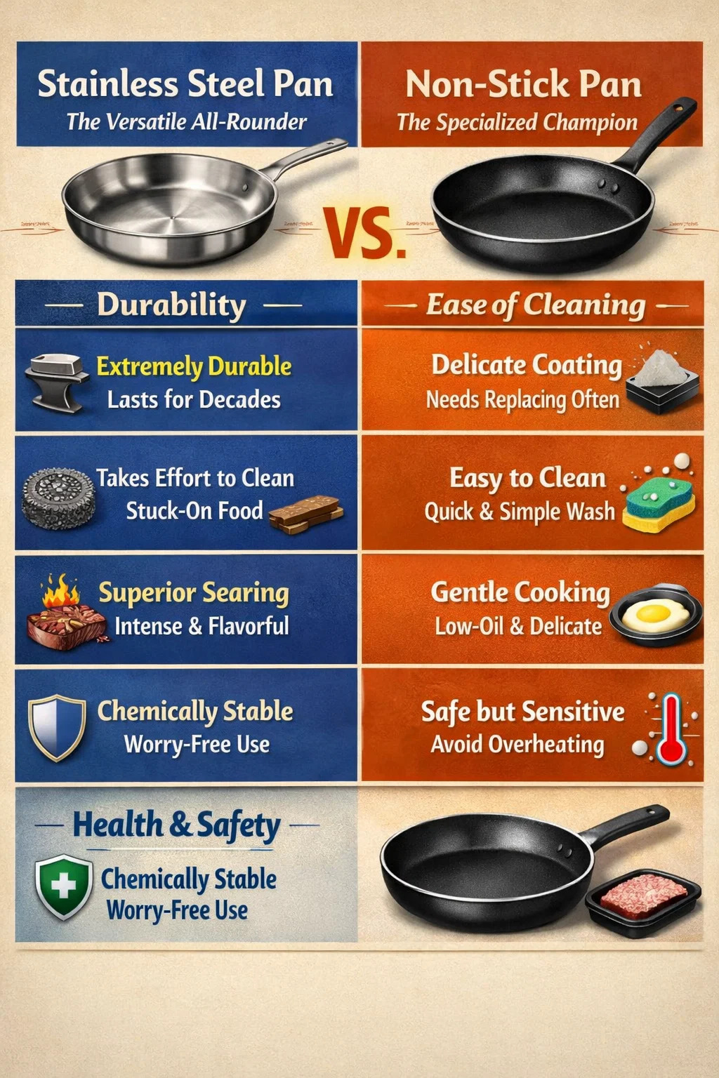 Khi lựa chọn dụng cụ nấu nướng, chảo inox và chảo chống dính đều có những ưu điểm riêng. Chúng không phải là trường hợp cái này thay thế cái kia mà giống như một “người đa năng” và một “nhà vô địch chuyên môn” trong bếp.