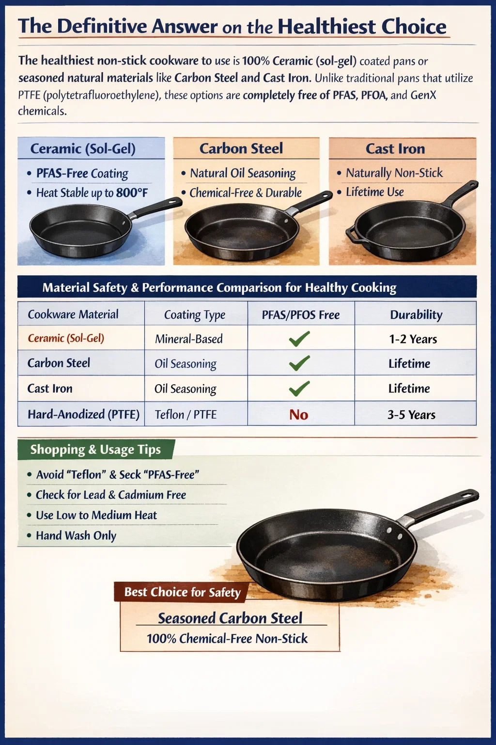 Khỏe mạnh nhất dụng cụ nấu ăn chống dính để sử dụng là Chảo được phủ 100% gốm (sol-gel) hoặc các vật liệu tự nhiên dày dặn như Thép Carbon và Gang . Không giống như các loại chảo truyền thống sử dụng PTFE (polytetrafluoroethylene), các tùy chọn này hoàn toàn không chứa hóa chất PFAS, PFOA và GenX. Đối với những người tìm kiếm cấu hình an toàn tuyệt đối với rủi ro hóa chất bằng 0 ngay cả ở nhiệt độ khô héo, thép carbon dày dạn nổi bật là sự lựa chọn hàng đầu vì nó tạo ra một lớp chống dính vật lý chỉ sử dụng nhiệt và dầu thực vật polyme hóa.