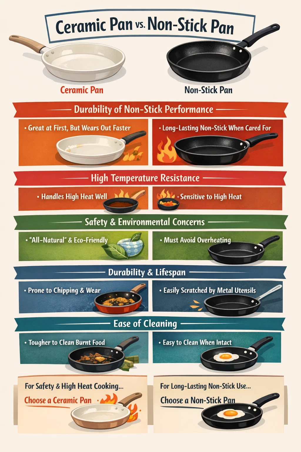 Dụng cụ nấu bằng gốm: Lớp phủ gốm cứng nhưng cũng giòn. Chúng dễ bị nứt hoặc sứt mẻ nhỏ, đặc biệt là khi chịu tác động hoặc thay đổi nhiệt độ mạnh (chẳng hạn như đặt dụng cụ nấu ăn nóng ngay dưới nước lạnh). Dụng cụ nấu chống dính truyền thống: Lớp phủ của chúng tương đối dẻo nhưng rất dễ bị trầy xước do vật cứng. Nếu bạn đã quen với việc sử dụng thìa kim loại hoặc cọ rửa Dụng cụ nấu bằng len thép thì loại Dụng cụ nấu này sẽ nhanh chóng trở nên không sử dụng được.